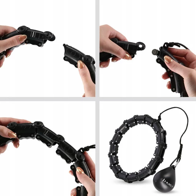 W szybki i prosty sposób zmniejsz lub zwiększ rozmiar koła, wpinając i wypinając tyle elementów, ile potrzebujesz. HHW02 posiada łącznie 24 elementy. Rozmiar można ustawić w zakresie od 14 do 24 elementów, czyli obwód w talii od 60 do 118 cm. Dzięki temu urządzenie nigdy nie spadnie podczas treningu. Mogą z niego korzystać także początkujący.